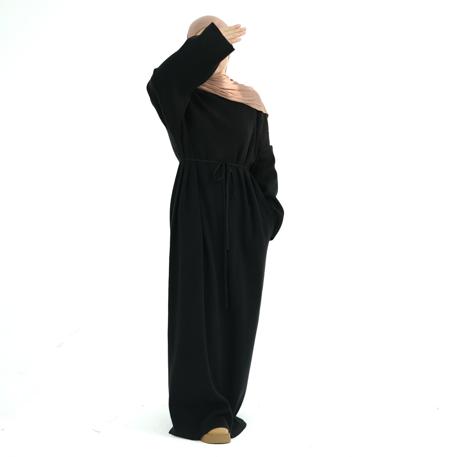 Vår AYLA Abaya är skapad för dig som vill kombinera värme, modesty och elegans under de kallare månaderna. Klänningen är lång, stickad och kommer med ett avtagbart bälte. Den mjuka kvalitén ger både komfort och värme. Klänningen finns i tre klassiska vinterfärger: svart, vit och brun. Perfekt att styla med en lång kappa, boots och vår HIDAYE jerseyhijab för en komplett vinterlook.