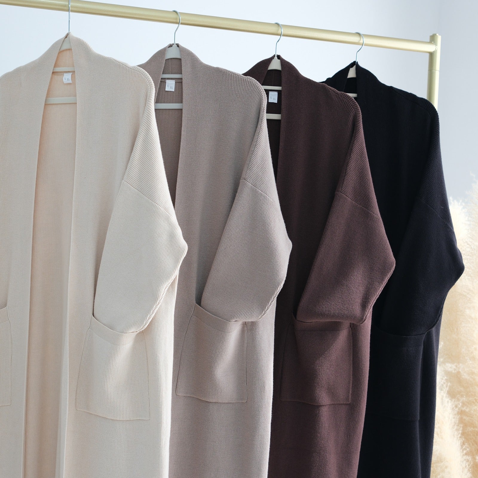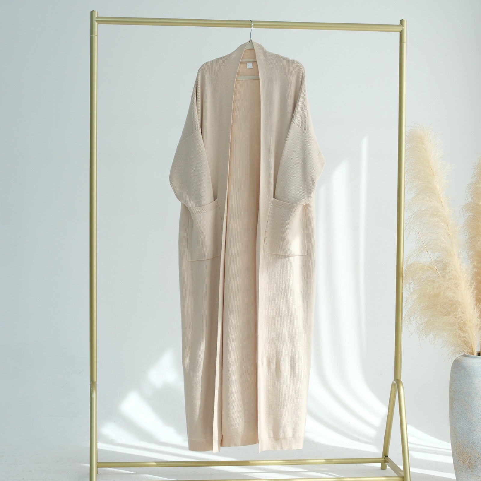 En elegant, öppen cardigan i samma mjuka stickade material som vår RUA Knit Abaya. Cardiganen har en avslappnad passform med långa ärmar och djupa fickor – perfekt för lager på lager-stil och kyliga dagar. De neutrala färger gör den enkel att kombinera med andra plagg i din garderob.